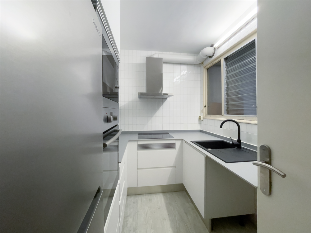 La cocina independiente, recién reformada, también está muy bien aprovechada y cuenta con armarios y estantes nuevos para la organización de los utensilios de cocina así como nuevos electrodomésticos. La estancia también dispone de ventanales que comunican con el balcón del patio interior destinado a la zona de lavandería y equipado con lavadora. Los ventanales además permiten la ventilación de la cocina y la circulación del aire una vez se ha cocinado para evitar olores.